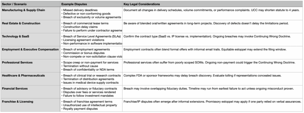 Yes. For example, supply chain disputes involving defective goods often fall under the UCC’s four-year rule. In contrast, breach of partnership or service agreements may be governed by CPLR’s six-year window. See our sector breakdown for examples.